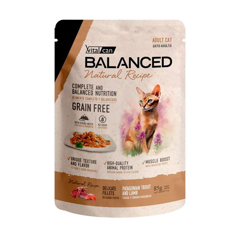Carne de trucha, agua de manantial, carne de cordero, aceite de pescado, pulpa de remolacha, taurina, sal, lisina, cloruro de potasio, metionina, levadura, carragenina, goma guar, tripolifosfato de sodio. Vitaminas: A, D3, E, K, B1, B2, ácido pantoténico, ácido nicotínico, B6, ácido fólico, biotina, B12, colina. Minerales: hierro, zinc, manganeso, cobre, yodo, selenio.
