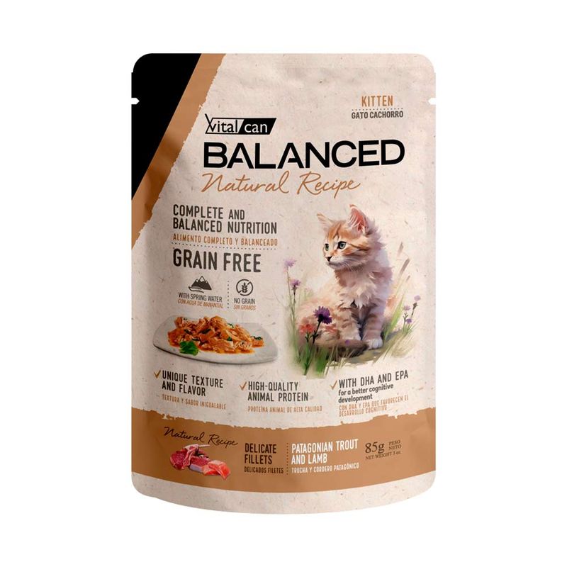 Carne de trucha, agua de manantial, carne de cordero, aceite de pescado, pulpa de remolacha, taurina, sal, lisina, cloruro de potasio, metionina, levadura, carragenina, goma guar, tripolifosfato de sodio. Vitaminas: A, D3, E, K, B1, B2, ácido pantoténico, ácido nicotínico, B6, ácido fólico, biotina, B12, colina. Minerales: hierro, zinc, manganeso, cobre, yodo, selenio.